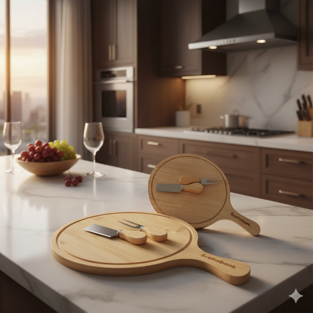 Tabla de charcuteria/picadera/quesos redonda con 4 accesorios.